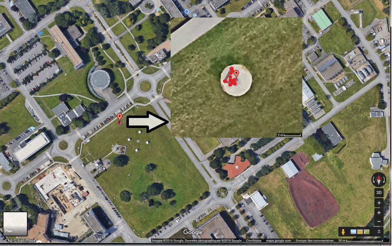 Les premiers tests, qui se sont déroulés sur le site du CNES à Toulouse au point VLBI (voir image ci-contre), sont encourageants. Le point VLBI est un point géodésique dont les coordonnées sont connues au millimètre près. Il est donc intéressant d’utiliser ce point en phase de test.