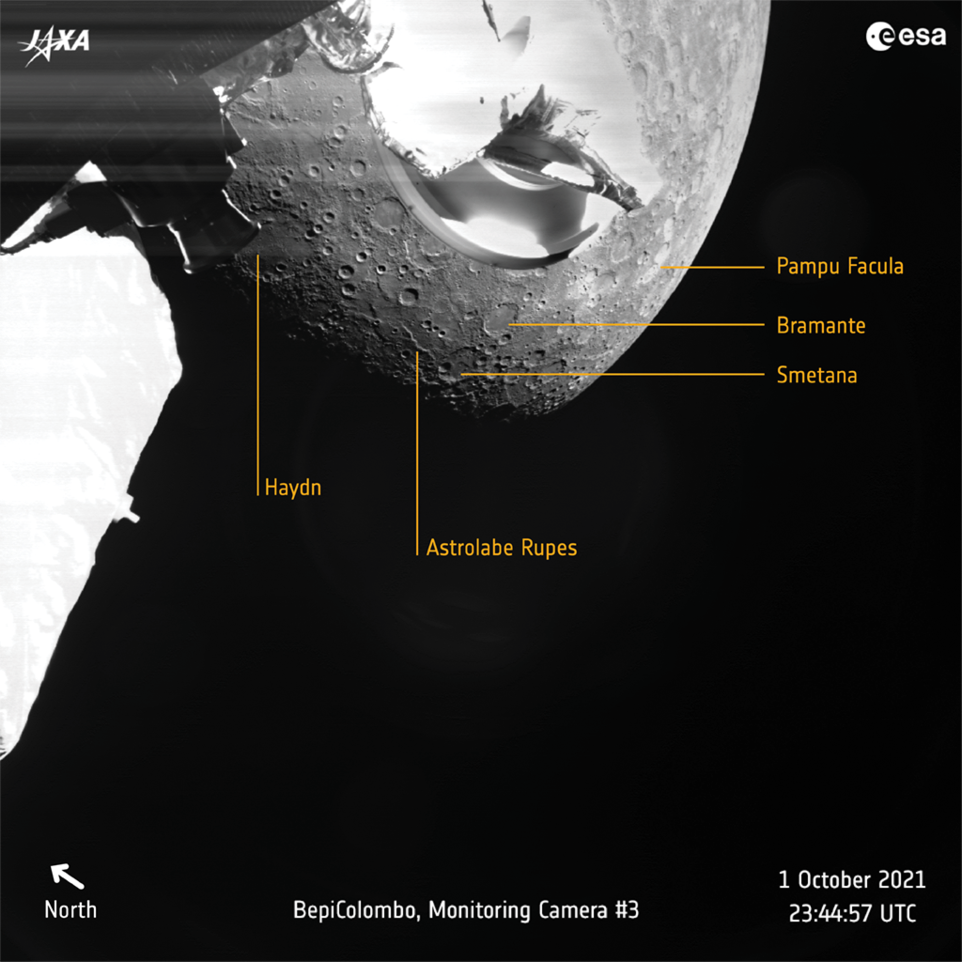 Les caméras techniques sur le module de transfert ont fourni des images en noir et blanc de 1024 x 2024 pixels. Elles ont été prises entre 5 minutes après le survol, à 1 000 km au plus près, et jusqu’à 4 heures plus tard. Prendre les photos plus tôt n’était pas idéal car la sonde arrivait côté nuit de Mercure. Elles sont présentées ci-contre par ordre chronologique.