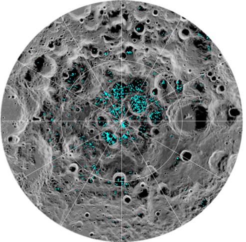 En turquoise, les glaces d'eau présentes au pôle Sud de la Lune. Crédits : NASA.