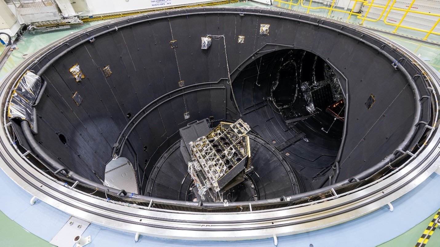 Le banc optique qui va accueillir les 26 caméras entre dans la chambre de test de l’ESTEC pour les tests de déformations thermo-élastiques. Crédits : ESA.