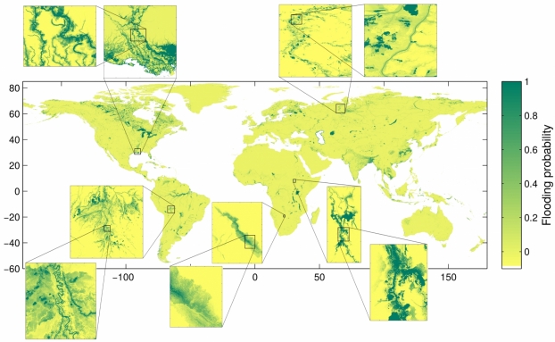 Probabilités d’inondation estimées par GIEMS-D3 pour l’ensemble du globe avec des zooms sur certains fleuves et zones humides. Crédits : Aires et al. 2017.