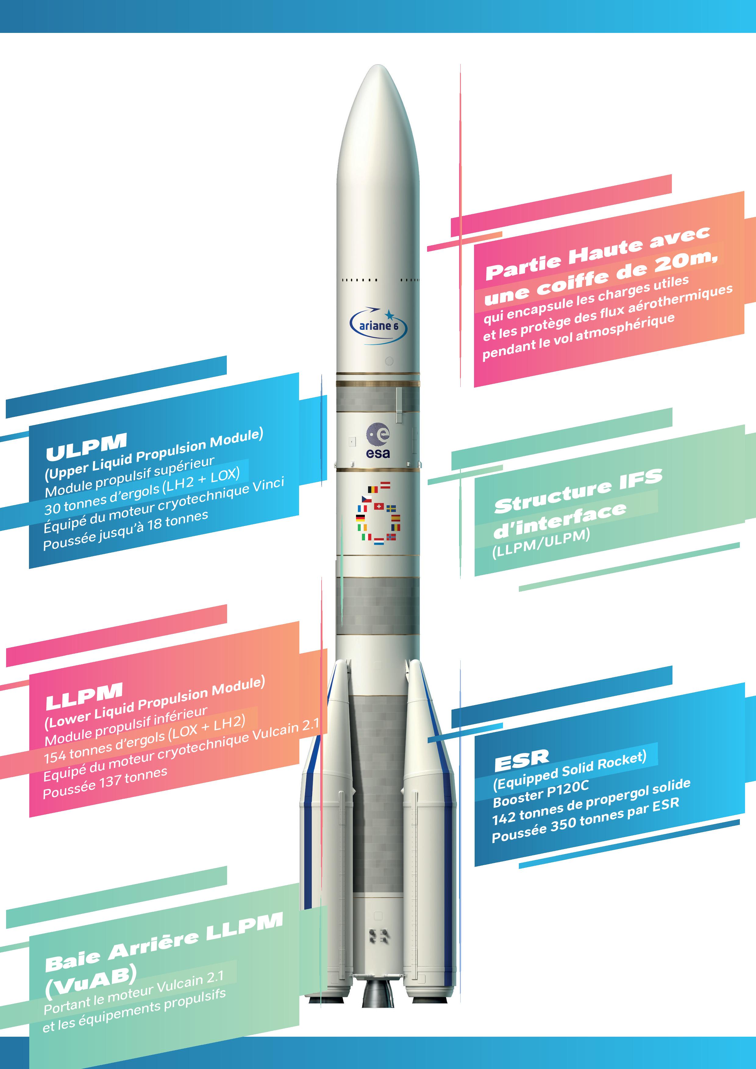 Haut de 62 m, le lanceur Ariane 6 est composé de 4 modules principaux, qui jouent chacun un rôle bien précis durant le vol spatial. Pour le décollage et l’essentiel du vol atmosphérique, ce sont les modules ESR (Equiped Solid Rocket) qui assurent la majeure partie de la poussée. Au nombre de 2 sur la version A62 et de 4 sur la version A64, ces modules sont principalement constitués des moteurs P120C, propulseurs à poudre remplis chacun 142 t de propergol solide, exerçant une poussée de 440 t au décollage (pour environ 350 t en moyenne au cours du vol ESR). Environ 134 sec après le décollage, les ESR ont achevé leur mission et sont largués.