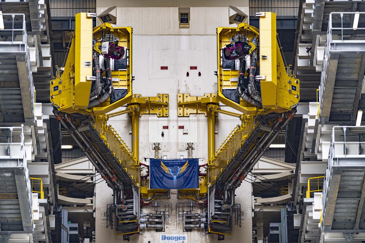 Après ces essais concernant la partie fluide, la campagne suivante a consisté à valider le pilotage mécanique des bras et des caissons par le banc de contrôle. Cette qualification technique consiste à commander l’ouverture des bras simultanément à une séquence synchronisée du lanceur, 3 fois en mode nominal et 2 fois en mode dégradé. « L’objectif est de réaliser un ensemble de mesures pour vérifier les temps de réaction et s’assurer que les équipements se comportent toujours de la même manière », explique Serge Mahé. Les mêmes vérifications sont ensuite réalisées sur les caissons MANG pour tester leur réponse aux ordres du banc de contrôle. A l’issue de ces campagnes, qui ont mobilisé une trentaine de personnes, pilotées pour le CNES par Olivier Ryckebosch et Thierry Figeac, les « early combined tests » CCS Cryo valideront en froid la connexion et la déconnexion des systèmes cryotechniques avec une maquette de lanceur, ultime étape avant les essais combinés sur le vrai corps central d’Ariane 6, arrivé en Guyane au mois de janvier.