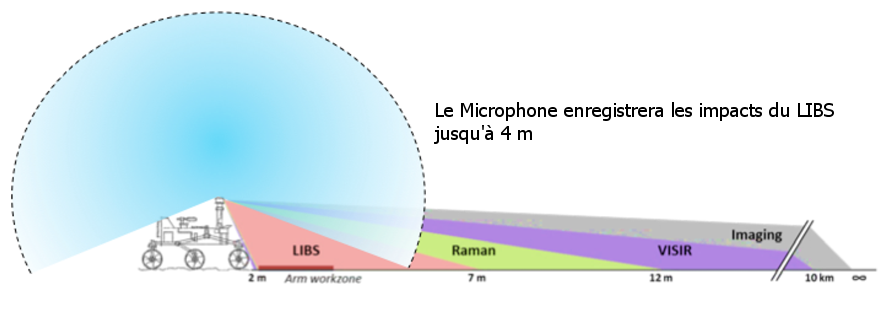 - le microphone embarqué, dernière nouveauté, enregistrera le son engendré par l’impact laser du LIBS sur la roche jusqu'à 4 mètres, ainsi que le vent et les bruits du rover.
