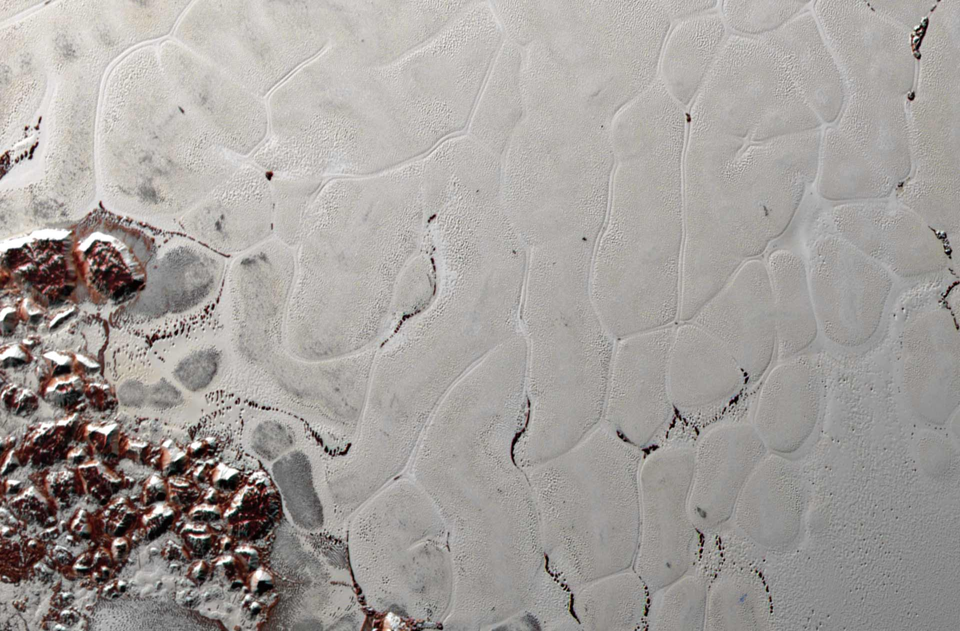 Structures polygonales observées à la surface de Sputnik Planitia sur Pluton.