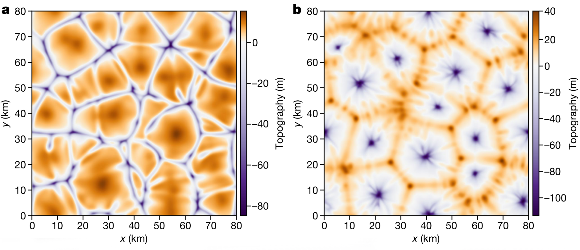 Mais le modèle classique de convection par chauffage par le bas ne fonctionne pas pour expliquer les structures de Pluton. En effet, dans les conditions qui règnent sur ce planétoïde gelé, si l’épaisseur de glace de Sputnik Planitia était principalement chauffée par en-dessous, les formes observées par la sonde New Horizons auraient dû être inversées par rapport aux données reçues : au lieu d’être bombées et séparées par des fossés profonds (ci-dessous à gauche), elles auraient dû être creuses, et séparées par des crêtes surélevées (ci-dessous à droite).