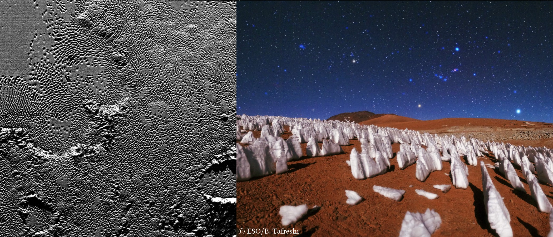 Sur Pluton, la sublimation de la surface glacée provoque la formation de « puits » imagés par la sonde New Horizons à gauche. Un mécanisme similaire est responsable de la création des « pénitents », ici dans le désert de l’Atacama.
