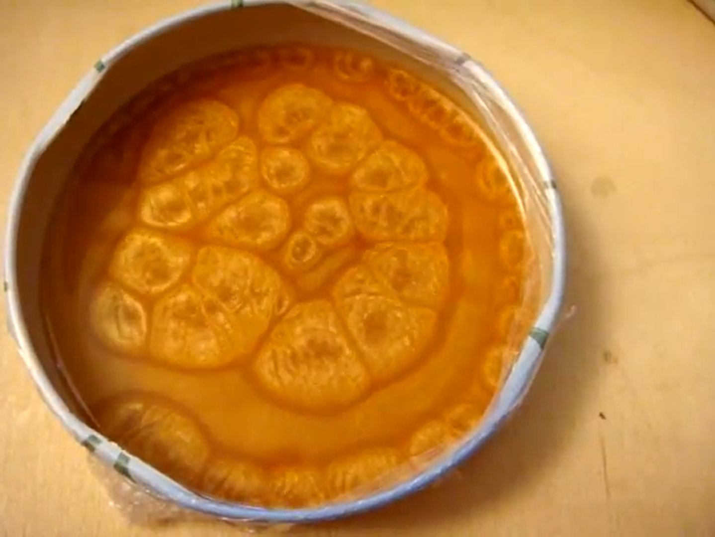 Peinture dorée diluée dans de l'acétone : l'acétone s'évapore, entraîne la convection, et forme des cellules de Bénard