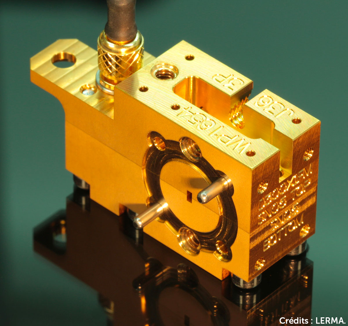 Une diode Schottky se cache à l’intérieur de cet élément doré appelé « doubleur 300 GHz » de la taille d’un morceau de sucre. Fabriqué par une PME française proche de Toulouse (SAP MicroMecanique) puis recouvert d’or en Bretagne par la société Kerdry, il a été assemblé en décembre 2019 au LERMA/C2N à Paris. Pourquoi l'avoir recouvert d’or ? Pour éviter la corrosion et surtout améliorer les performances en limitant les pertes de signal traité par l'instrument SWI qui détectera les ondes électromagnétiques naturellement émises par Jupiter. En février 2020, ce doubleur va subir des tests thermiques au LERMA/C2N et de vibrations chez MecanoID à Toulouse avant de partir pour l’Allemagne où il sera monté avec les autres éléments du radiotélescope SWI, et notamment son miroir principal de 29 cm de diamètre.