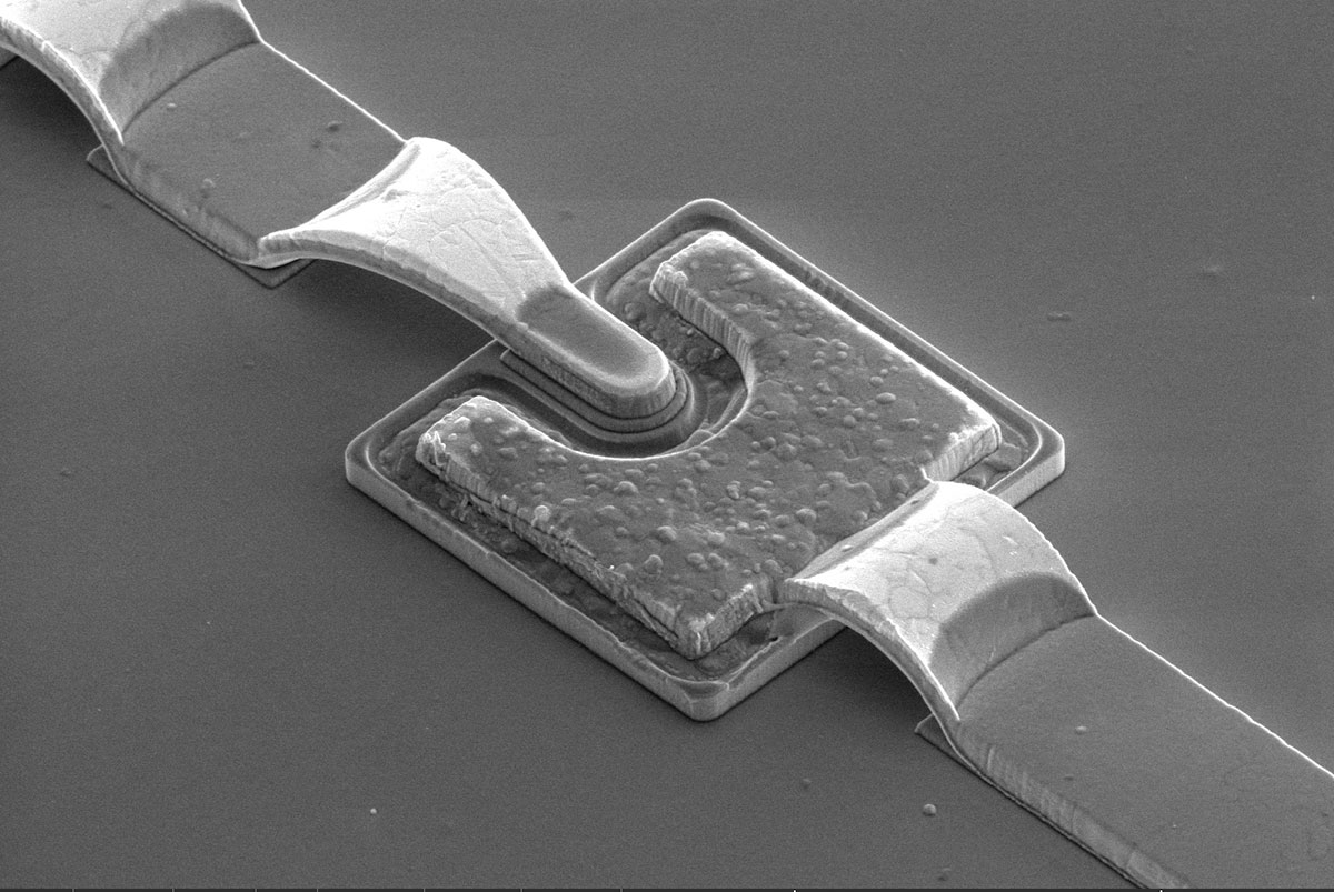Cette image au relief très marqué a été réalisée avec un microscope électronique à balayage. Il faut dire que l’élément en photo, une diode Schottky, est minuscule : 13 x 15 x 5 µm ! Pour comparaison, le diamètre d’un cheveu est d'environ 50 μm.