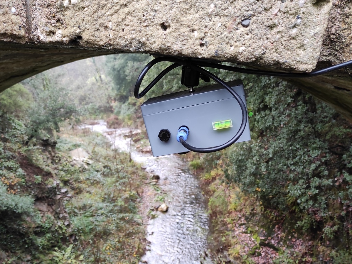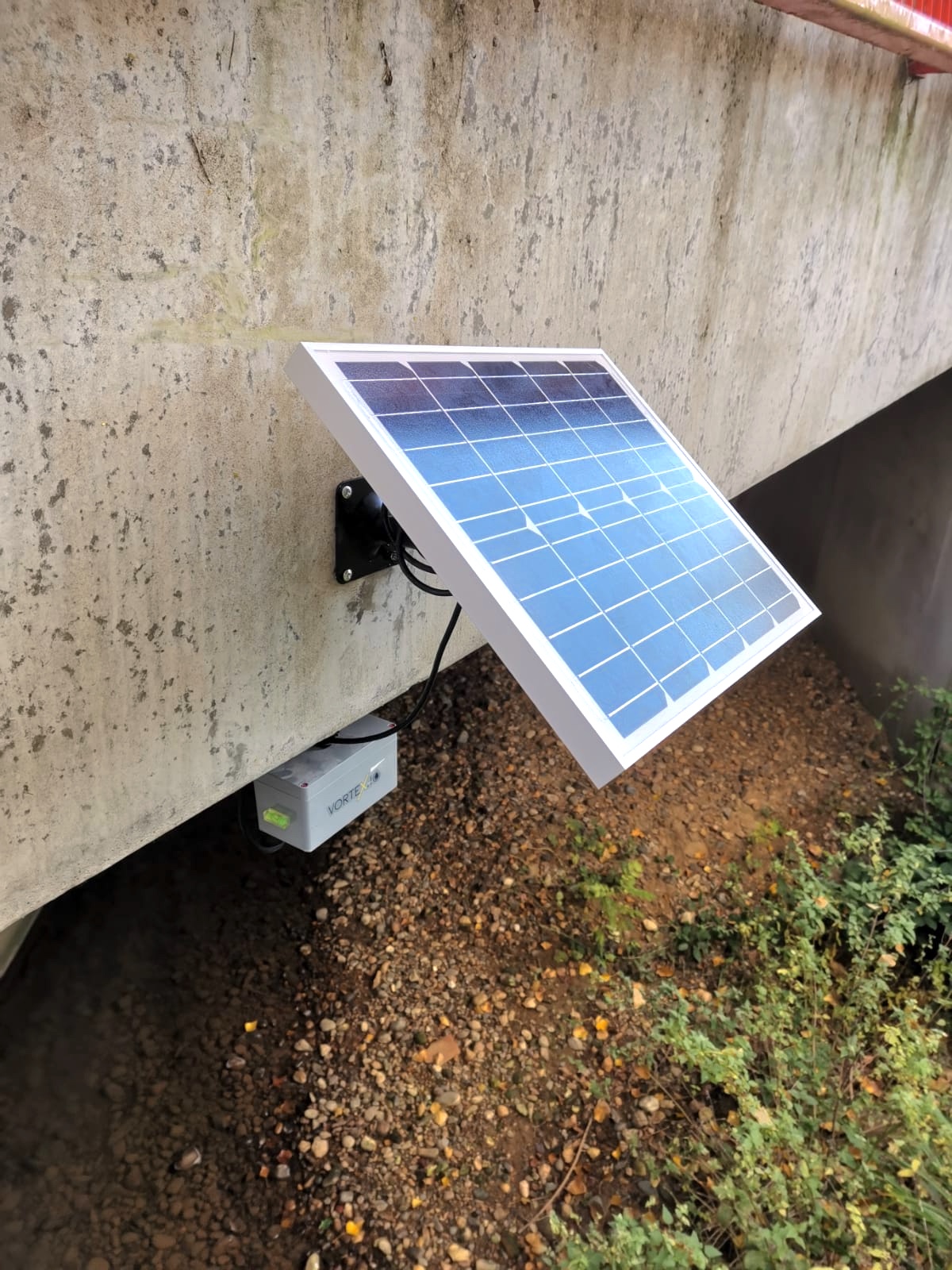 La micro-station hydrologique est totalement autonome en énergie grâce au panneau solaire qui l'alimente. Crédits : vorteX-io.