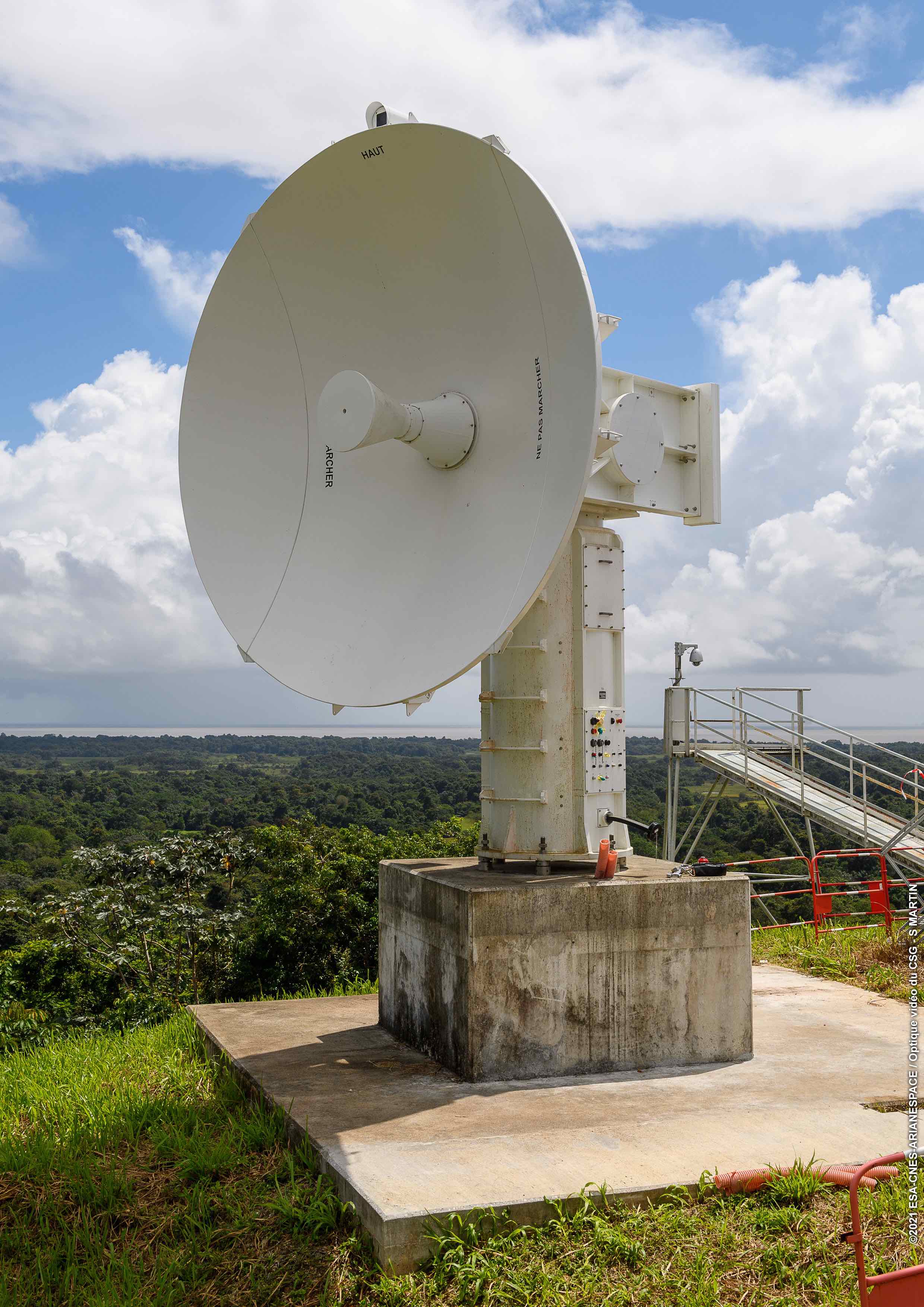 Au sol, des radars (comme ici Amazonie 1) suivent eux aussi le lanceur lors du tir pour assurer la redondance de l'information. Crédits : 2021 ESA-CNES-ARIANESPACE/Optique vidéo du CSG - S Martin.