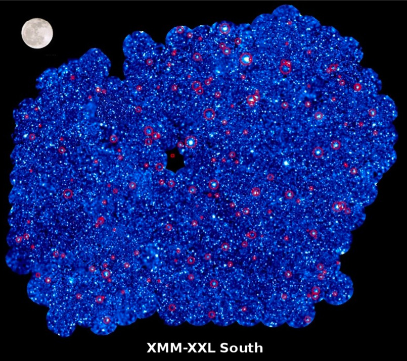 Entre 2010 et 2013, le satellite XMM-Newton a passé plus de 2000h à capter les rayons X provenant de 2 grandes régions du ciel dans le cadre du projet XXL. Ce projet hors norme, qui rassemble une centaine de scientifiques internationaux, a permis de détecter un nombre considérable d’amas de galaxies lointains et de noyaux galactiques actifs (des galaxies possédant un trou noir super-massif en leur centre), seuls objets à émettre des rayons X hors de la Voie lactée.