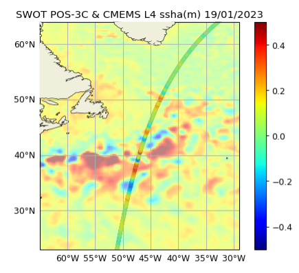 L’altimètre Poséidon-3C a aussi transmis des informations sur la hauteur de l’océan, en particulier lors de son passage au-dessus de l’Atlantique le 19 janvier. La figure illustre très bien la cohérence entre les élévations en rouge et les creux en bleu observés par l’instrument de SWOT (trace plus sombre), et la carte issue des autres altimètres de la constellation altimétriques (Jason-3, SARAL, Sentinel-6 ...) pour la même journée.