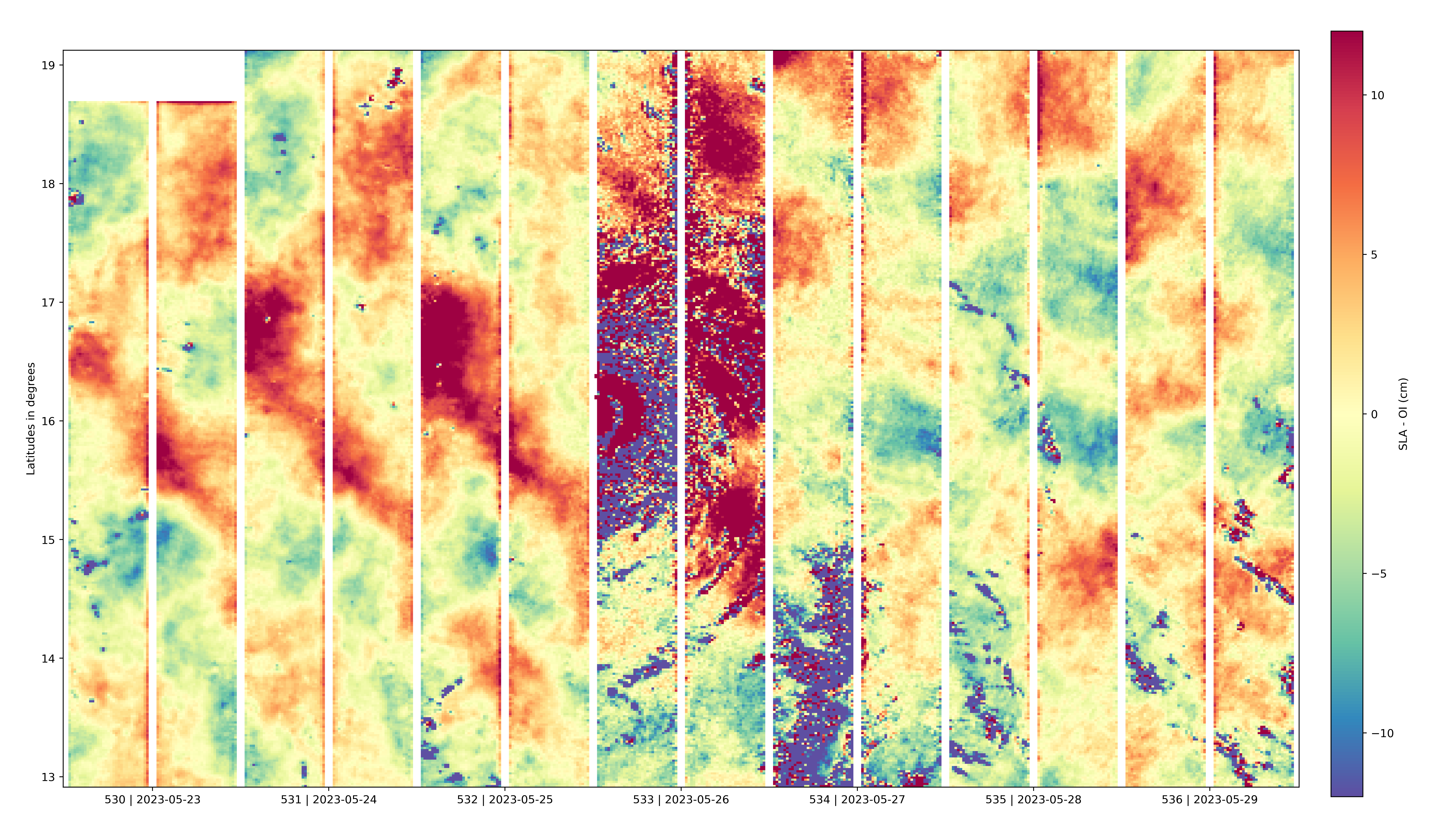La 2de image présente les mesures de SWOT au-dessus de la même zone géographique pendant 6 jours consécutifs. Elle permet de constater l’élévation de la surface de l’océan trois jours avant l’arrivée du typhon Betty/Mawar puis le jour de son passage et deux jours après.