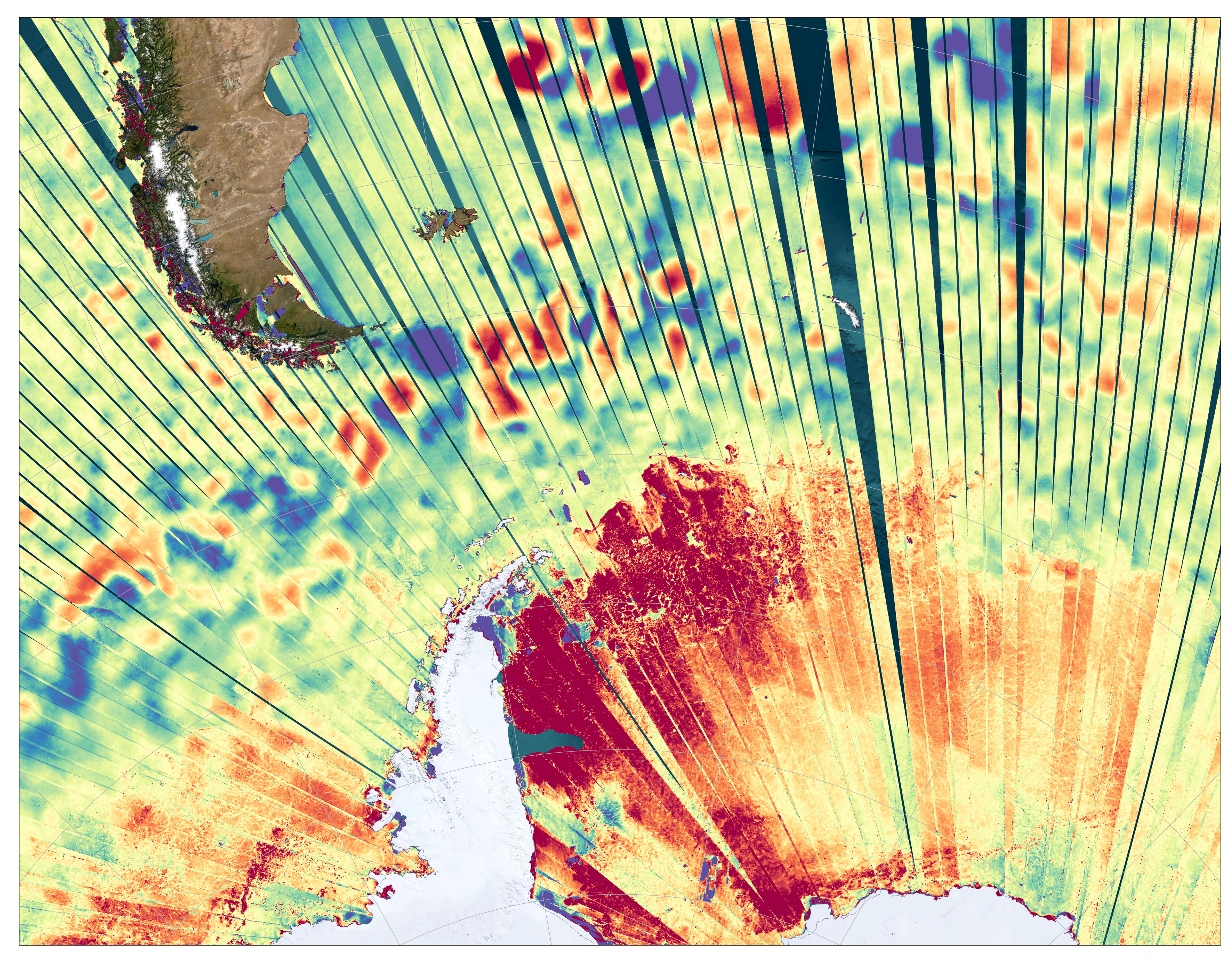 Données acquises par le satellite SWOT au-dessus de l’océan Austral - Crédits : CNES / NASA – JPL / Science Team SWOT / CLS, 2023.