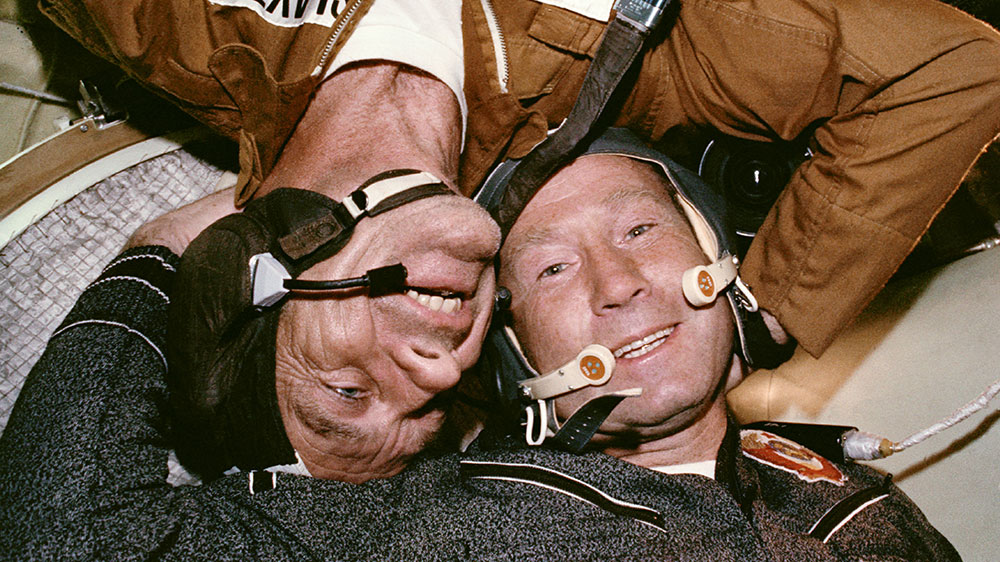 Le 17 juillet 1975, un vaisseau russe Soyouz et un vaisseau américain Apollo s’arriment ensemble. Cette première mission conjointe américano-soviétique est le symbole d’une trêve entre l’Union soviétique et les États-Unis. Deux jours durant, leur équipage respectif vivront ensemble et enverront des messages de paix et de coopération vers la Terre.