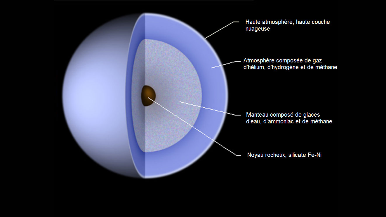 Le noyau et le manteau de Neptune ne sont pas gazeux. Le noyau, composé de nickel, de fer et de minéraux (silicates), est à une température de presque 8 000°C, soit plus chaud que la surface du Soleil ! Et au cœur de Neptune, la pression est 8 millions de fois supérieure à celle qui règne dans l’atmosphère terrestre. Dans ces conditions, les glaces fondent, et constituent alors une sorte de gigantesque bain brûlant d’eau, d’ammoniac et de méthane liquides.