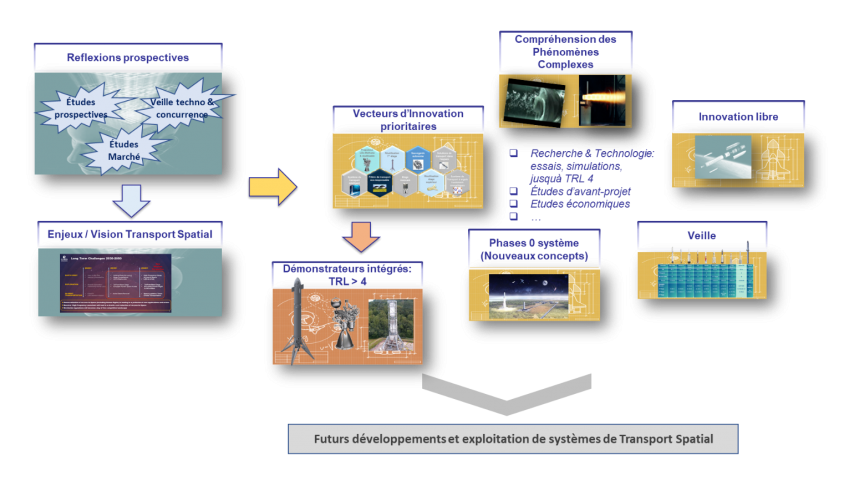 - Les réflexions prospectives, de marché et de veille, élaborées conjointement avec la Direction de la Stratégie, permettent d’établir d’une part une vision prospective à moyen/long terme des principales missions et principales technologies capacitantes pour le transport spatial européen de demain, et d’autre part les axes de travail prioritaires en termes d’innovation à maturer à moyen terme, pour les segments bord et sol du transport spatial, nommés Vecteurs d’Innovation Prioritaire (VIP)