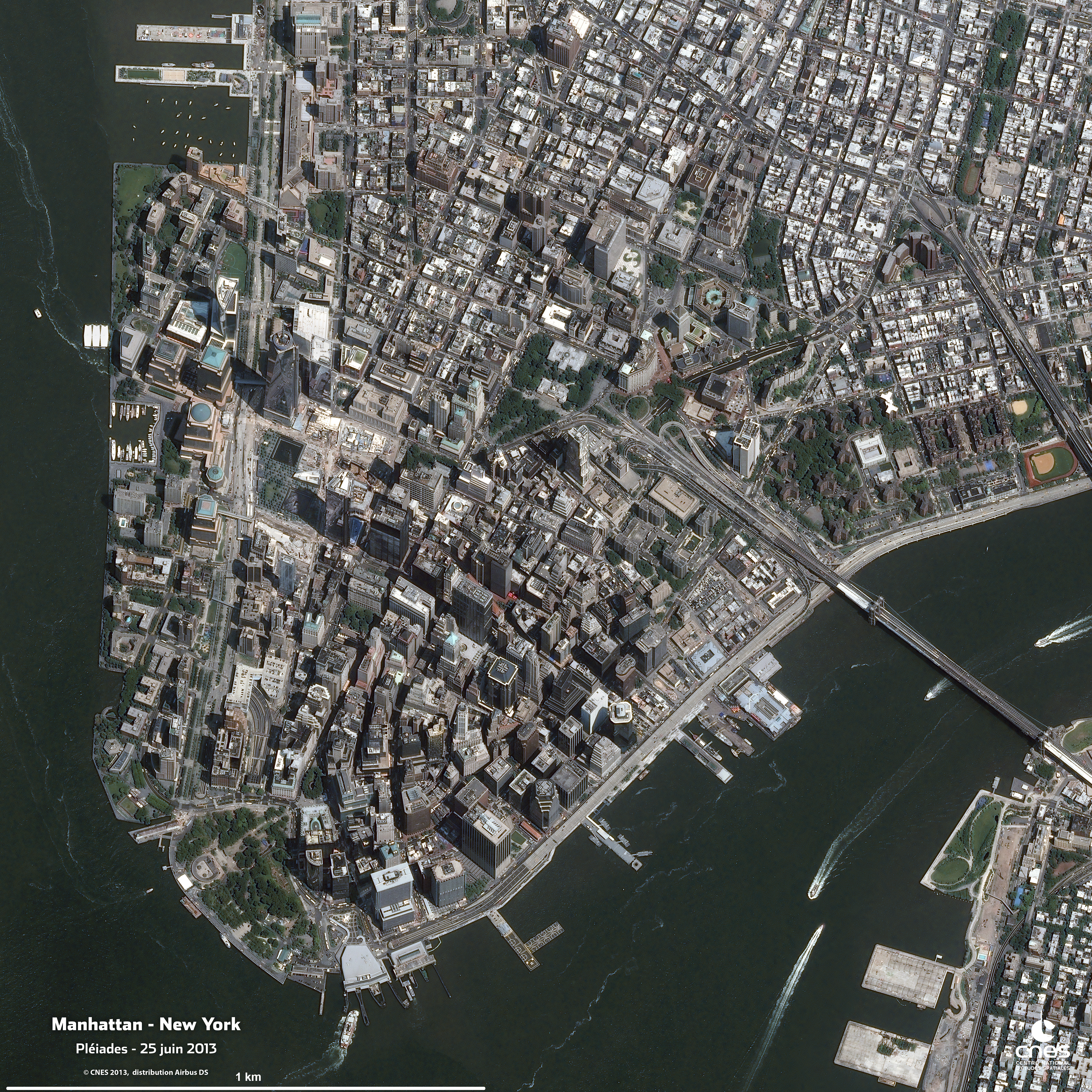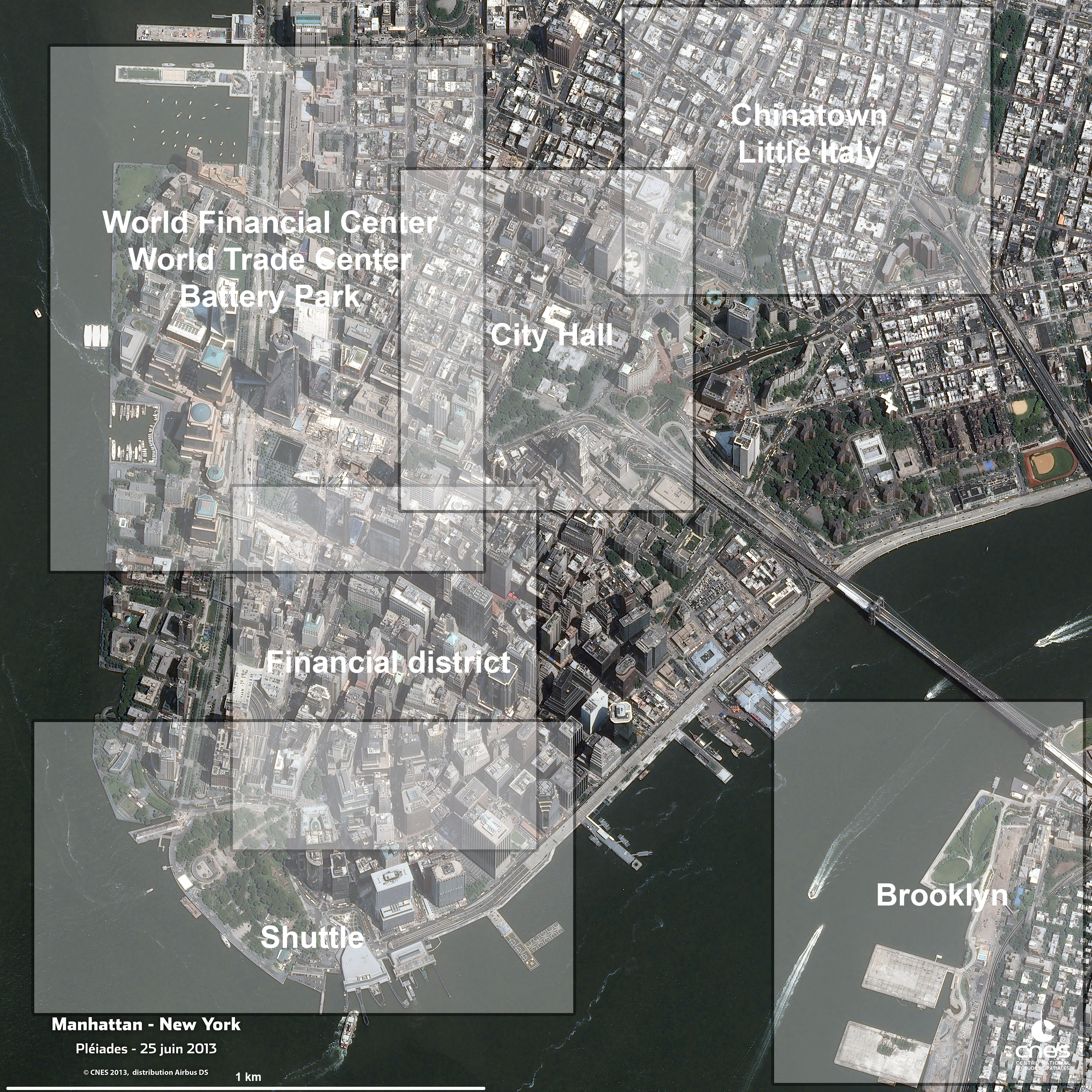 Le Lower-Manhattan ici présenté constitue un abrégé, un précipité, de la ville mondiale qu’est la métropole new yorkaise. Il concentre une pluralité de fonctions de commandement qui interagissent tant à l’échelle locale que mondiale. L’image satellite permet de discerner le NYSE (Wall Street) qui compose, au cœur du Financial district, la plus grande place financière qui oriente l’ensemble des bourses mondiales. On devine aussi sur la rive Sud, la fameuse skyline, véritable paysage identitaire de la ville et qui en reflète la puissance économique, abritant les sièges sociaux de grandes firmes américaines (AIG, American Express, …), présentes dans le monde entier.