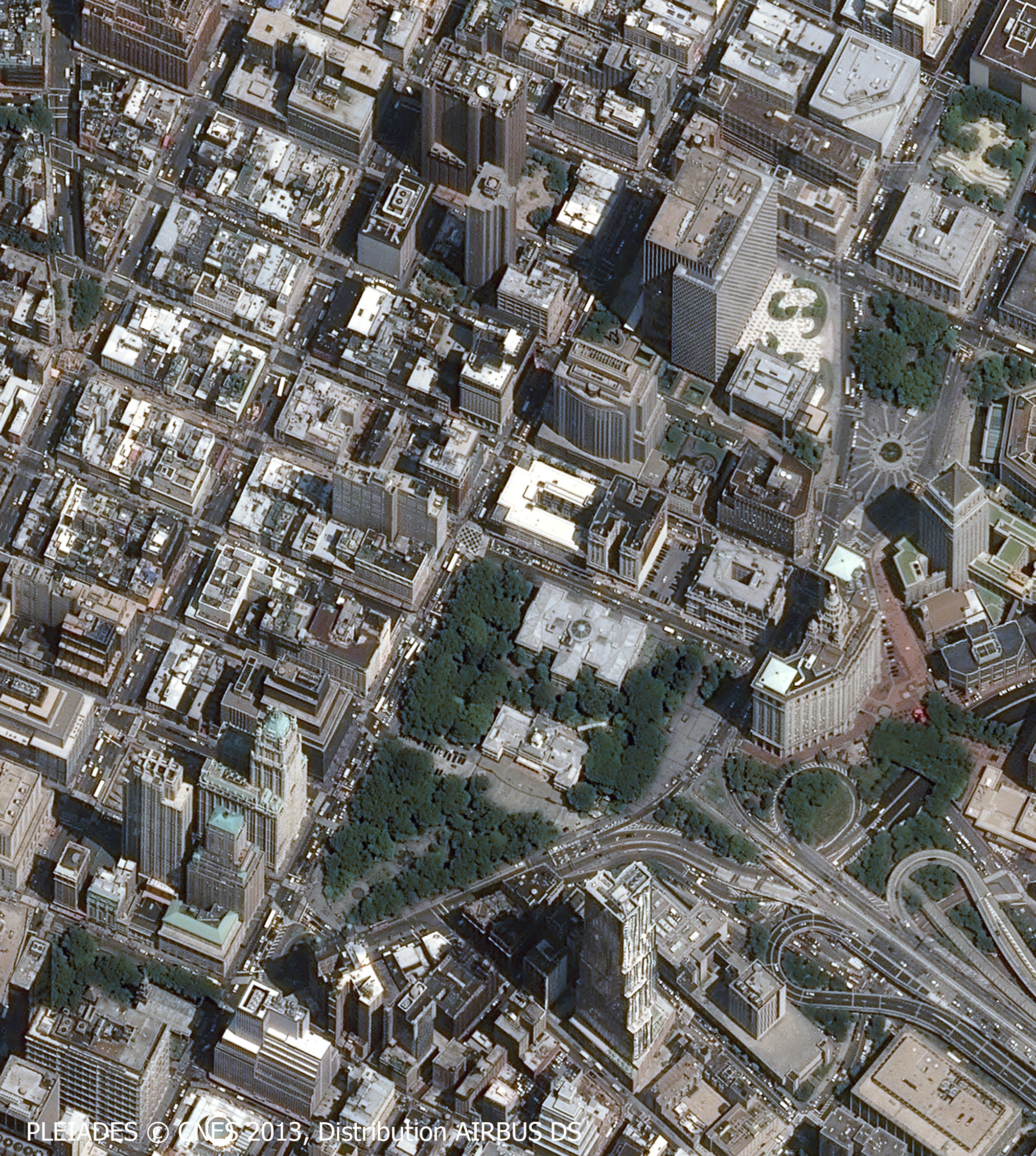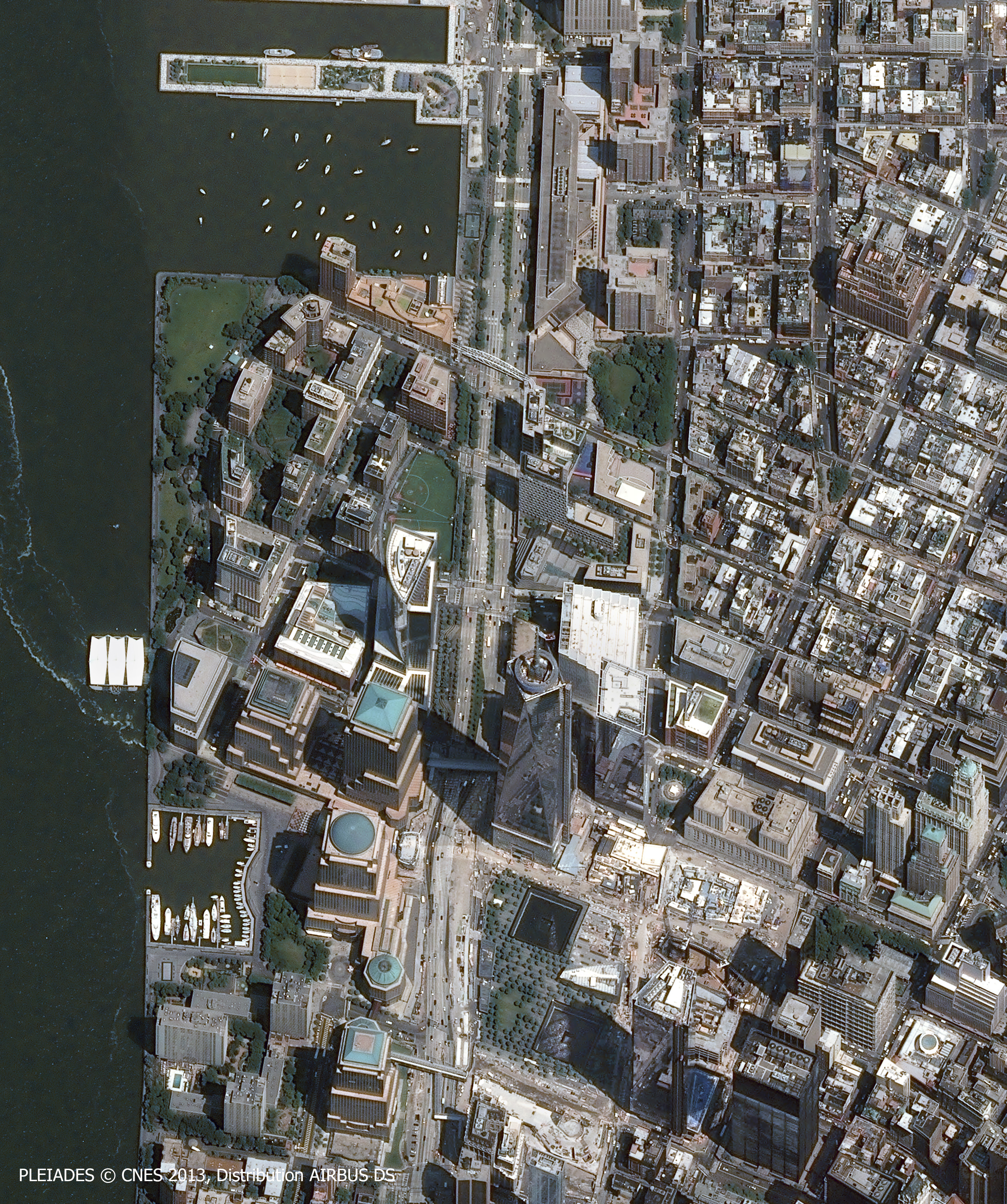 L'image satellite fait ressortir sur la droite un quartier en chantier, qui cicatrise ses plaies. Une tour toute moderne, la Liberty Tower, particulièrement haute puisque c’est en 2018 la plus haute des Etats-Unis, marque ce renouveau et un orgueil national intact : symboliquement, elle est haute de 1 776 m., comme la date d'indépendance des Etats-Unis. A côté, deux chantiers annoncent la construction de deux autres tours. A l'emplacement des tours détruites, un mémorial, conservant leurs fondations, rappelle leur destruction par une présence-absence. Enfin, une nouvelle gare - l'Oculus blanc construit par l'architecte Calatravas - qui fait aussi office de centre commercial et un musée ont été adjoints.