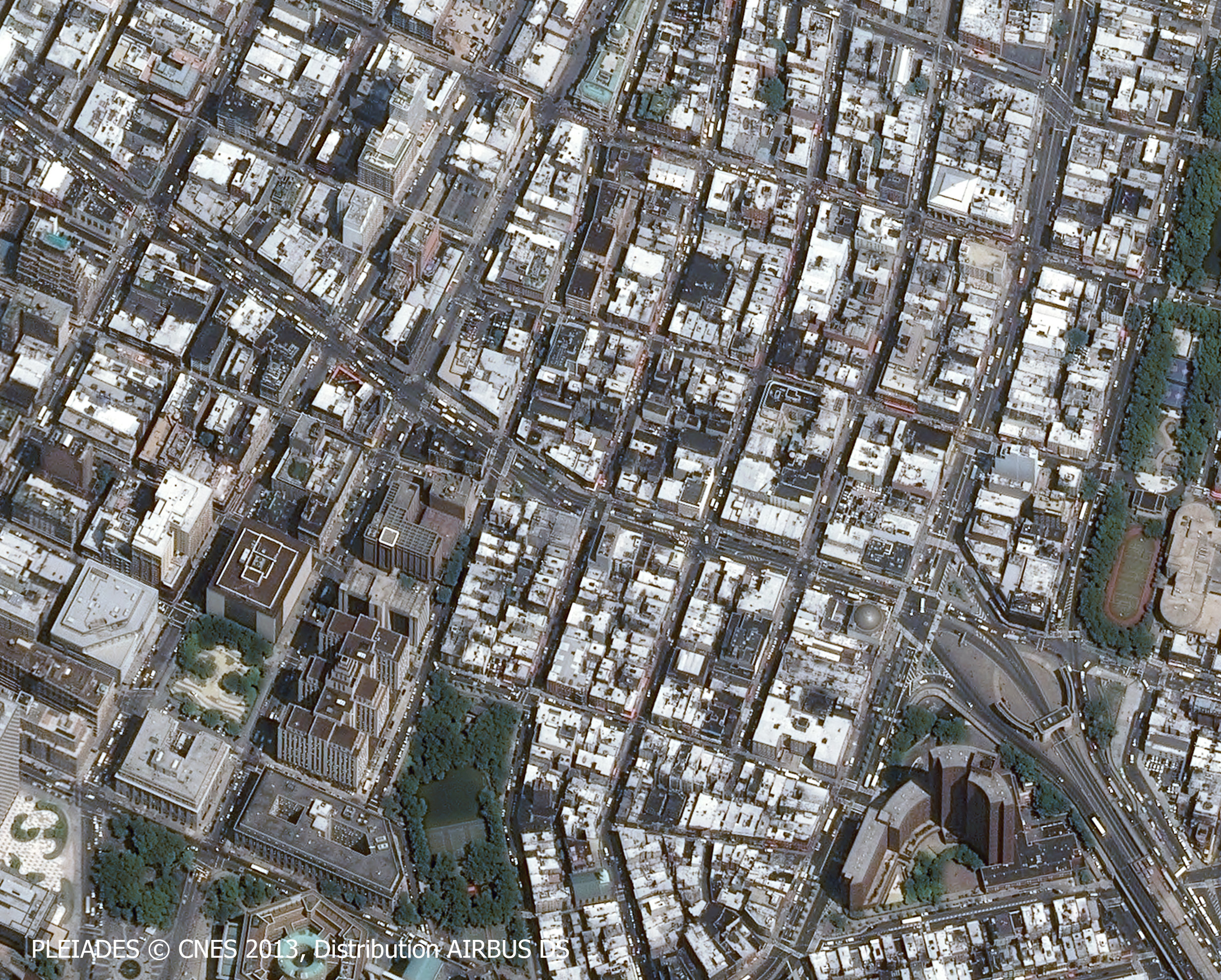 Cette image a été prise par un satellite Pléiades le 25/06/2013. Il s’agit d’une image en couleurs naturelles, de résolution native à 0,70m, ré-échantillonnée à 0,5m.