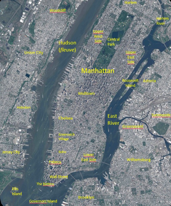 On distingue sur cette image les cinq arrondissement : l'île de Manhattan au centre, les quartiers de Brooklyn et du Queens à droite, le Bronx en haut à droite et Staten Island en bas à gauche