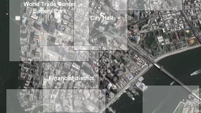 Ce zoom sur l'extrême Sud-Ouest de la Manhattan fait ressortir deux espaces distincts, le World Trade Center à droite et Battery Park City à gauche, séparés par une triple voie (West Street, elle même doublée d'une piste cyclable).