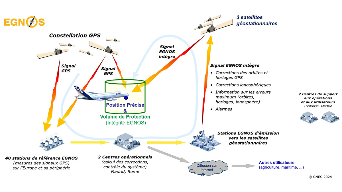 Après son développement entre 1995 et 2009, EGNOS a été certifié pour l’Aviation Civile en 2011. Le système EGNOS mesure les signaux de la constellation GPS avec un réseau européen d’une quarantaine de stations et compare ces signaux avec la position des stations. Il en déduit les erreurs de positionnement et l’intégrité des signaux GPS au sein d’un système centralisé pour former une « information certifiée » qu’il code dans des messages standardisés. Les charges utiles EGNOS déployées sur plusieurs satellites géostationnaires transmettent ensuite ces messages vers les utilisateurs.