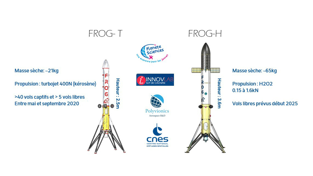 FROG est un acronyme récursif qui veut dire « FROG, a Rocket for GNC demonstration ». Initié par la Direction des Lanceurs du CNES pour tester des algorithmes d’atterrissage de lanceurs réutilisables, FROG est un ensemble de démonstrateurs à petit échelle de concepts VTVL (Vertical Take-off, Vertical Landing, Décollage vertical, atterrissage vertical). FROG-T, avec ses 2.5 mètres de haut et 30 centimètres de diamètre, a un rôle de véhicule d’apprentissage. Les équipes du Transport Spatial du CNES, avec les partenaires industriels (Polyvionics, DroneCenter,), universitaires (IUT Cachan/Innovlab) et associatifs (Planètes Sciences), y greffent de nouveaux algorithmes de guidage, navigation et contrôle du vol (GNC) avec l’objectif de tester de façon réactive et avec des temps de développements courts, de nouvelles solutions. Ces idées une fois validées pourront être intégrées dans des architectures plus importantes comme les démonstrateurs réutilisables Callisto, Themis et d’autres projets qui verront le jour dans la prochaine décennie. Au-delà des technologies liées au GNC, FROG-H pourrait servir de banc d’essais volant pour d’autres technologies comme par exemple des mesures innovantes.