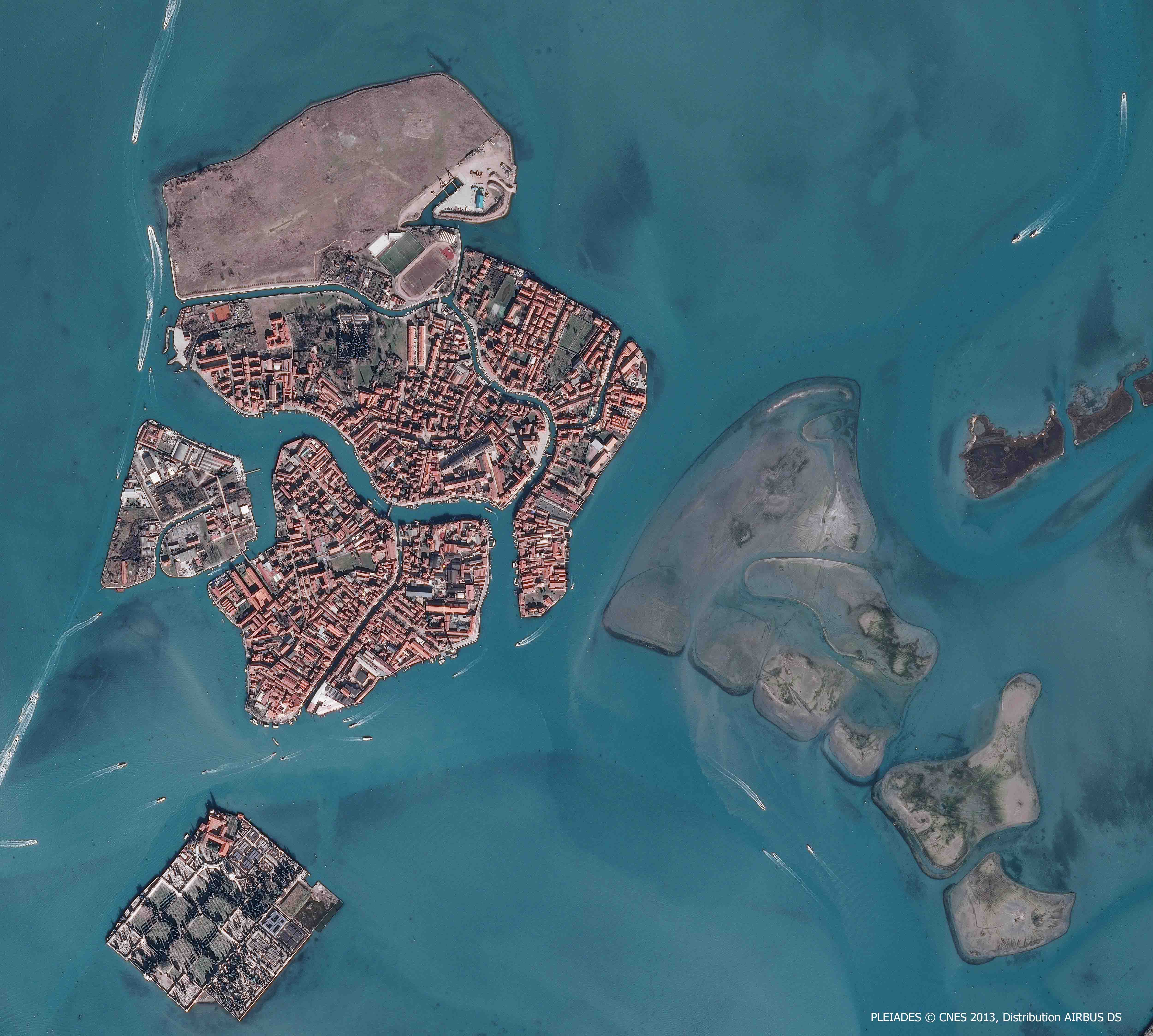 Cette image donne à voir le centre de Venise, relié par le pont de la Liberté au continent. De Tronchetto et de la zone maritime, jusqu’à l’entrée du Castello (étudié dans le zoom 3), en passant par Cannaregio, San Marco, Santa Croce, San Polo, Dorsoduro et au sud l’île de la Giudecca, l’image propose de s’intéresser au cœur historique et touristique de la Sérénissime.