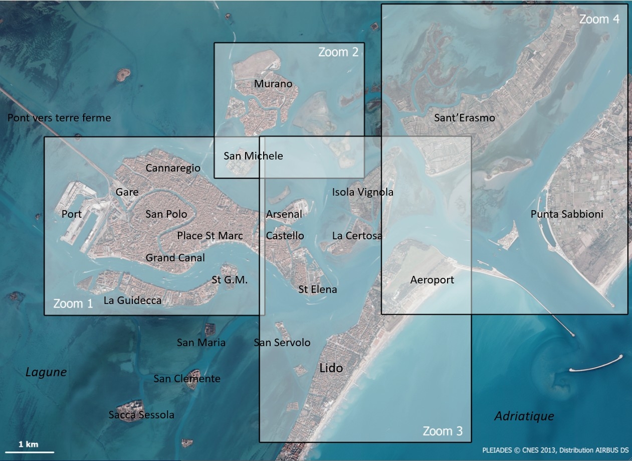 L’image présente Venise et ses six quartiers, nommés sestieri, séparés par le Grand Canal. A l’ouest, le pont de la Liberté permet de relier Venise à la terre ferme. Au nord se trouvent l’île de San Michele, île-cimetière de Venise, et l’île de Murano, connue comme l’île du verre. Au sud-est, le lido de Venise est un fin cordon littoral d’une douzaine de kilomètres de long, à la fois plage pour les Vénitiens et siège de la Mostra. A l’extrême est de l’image se trouve Cavallino-Treporti, où campings et plages attirent les touristes. Entre cet espace et Murano se distinguent des îles de la lagune comme Certosa, Vignole et « le jardin de Venise », San Erasmo, la plus vaste des trois îles, où domine l’agriculture.